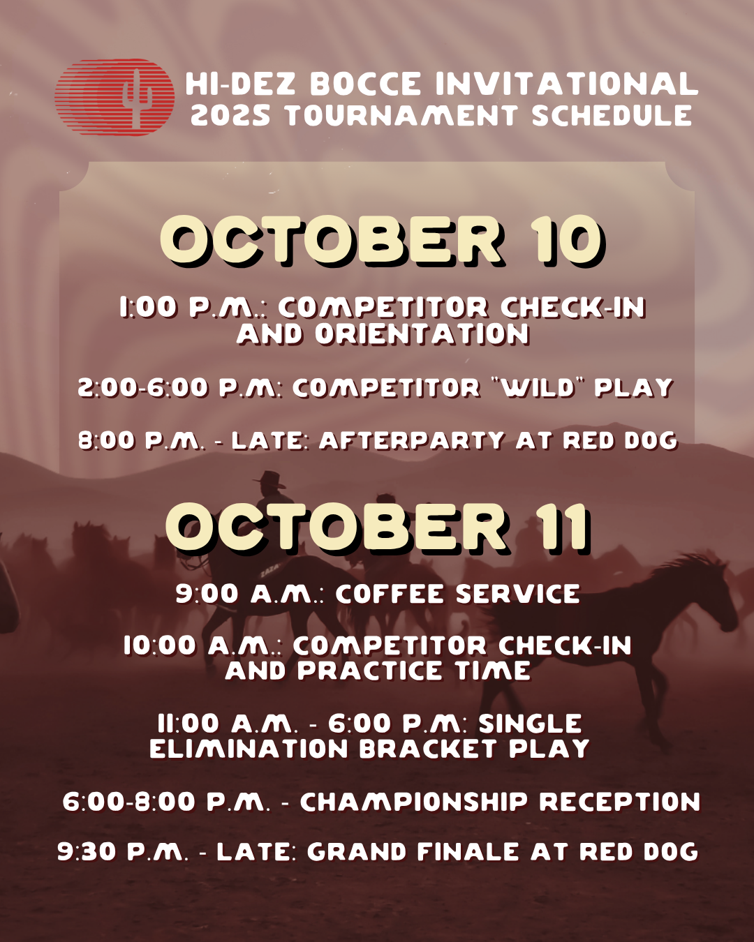 For “pool” play, games will be played in designated zones on uncultivated desert land. To avoid breakage of bocce balls and other hazards, please try to avoid throwing the pallino or bocce balls near obstacles such as large rocks or native plants. Use good judgment and re-throw the pallino if it comes to rest too close to hazards.